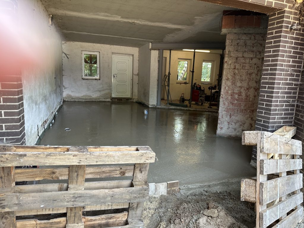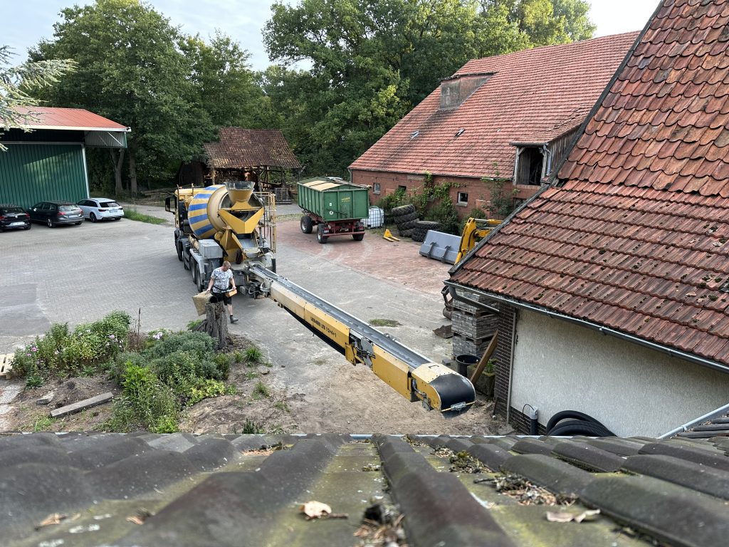 Beton in die Baustelle – der Boden wird gegossen. Danach ab zur Arbeit!