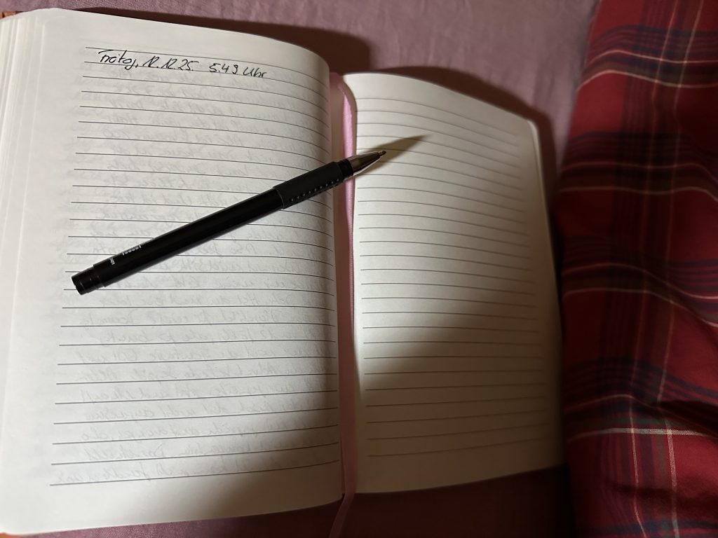 Der Tag hat um kurz vor sechs zum zweiten Mal begonnen – offenbar wollte mein Körper heute im Schichtbetrieb wach sein, denn um 03:17 Uhr hatte er schon einmal Dienstbeginn. Zur moralischen Unterstützung lagen meine Morgenseiten (wie immer) bereit, die ich im Bett geschrieben habe. Wie man unschwer erkennt, ist das Ganze in die frisch aufgezogene Weihnachtsbettwäsche eingebettet. Ja, es ist erst der 12., aber mein Bett lebt seit gestern in festlicher Vorfreude.